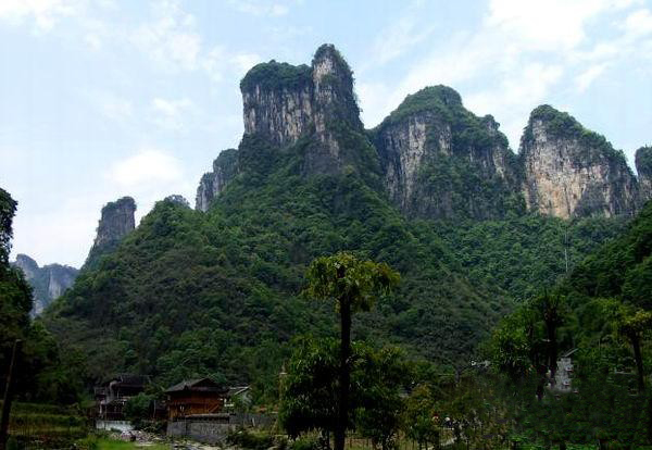 從玉鉆峰沿公路向北行2公里,但見溪谷兩岸石壁陡峭如削,高千仞,絕壁間石紋如,青白相間,加上有古木翠草點(diǎn)綴,如同屏。這就是“天門壁”。走過“天門壁”,便見三座石峰緊緊相連,這就是“相依巖”。高200余米,活象三個(gè)石人相依而立,靠前的一個(gè)是頭戴銀花首飾、身著百褶花羅裙的苗姑,緊靠后的一個(gè)是頭纏花帕、身穿對(duì)襟短衣的苗族男子,靠左的一個(gè)是頭纏絲帕、身著胸襟式土布衣的老媒人。