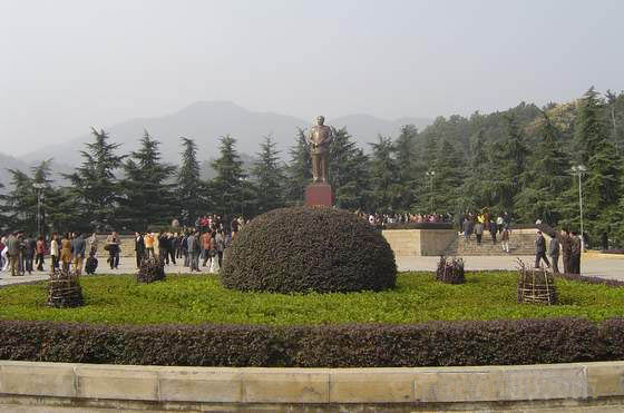 毛澤東銅像位于韶山沖的中心,紀(jì)念館、毛氏宗祠與韶山賓館之間。銅像區(qū)占地5200平方米,是經(jīng)中共中央批準(zhǔn)興建紀(jì)念毛澤東同志誕辰100周年的重點獻(xiàn)禮工程。這里原是一片沃野,地勢平坦開闊,周圍群山拱護(hù)。韶蜂在遠(yuǎn)處,高峻挺拔,云富坨大山巍峨雄壯,十八羅漢山逶迤綿長,黑石寨鐵骨錚錚。在山的襯托下,銅像更顯得氣勢磅礴。