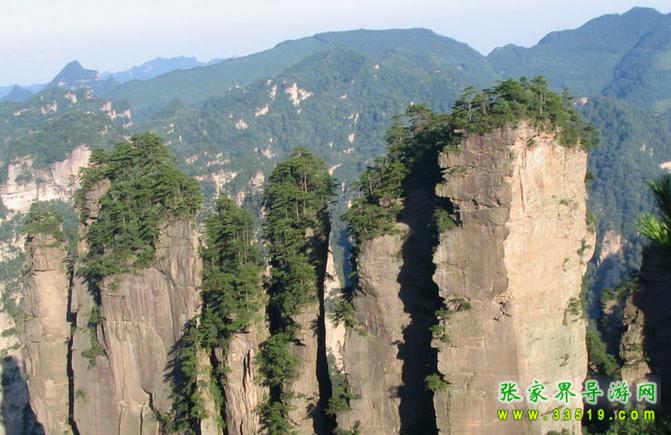 黃石寨西北崖沿下,6座高達(dá)200多米的橢圓形石柱,呈南北向一字排開在黃石寨與袁家界之間約2000米長的溝谷中。石柱大小和間距相當(dāng),柱頂皆為平臺(tái),似一派待建橋面的橋墩。中間兩墩稍高,兩邊漸次降低。各柱頂可連成一條弧線,氣勢恢宏。橋墩下河床干涸,怪石嶙峋,樹木依稀,顯得古野、蒼涼。雨天,云霧滿壑,似一江怒濤,橋墩時(shí)隱時(shí)現(xiàn)。若逢東邊日出西邊雨時(shí),便有絢麗壯闊的彩虹南北飛架,與橋墩形成雙美合壁的奇觀。