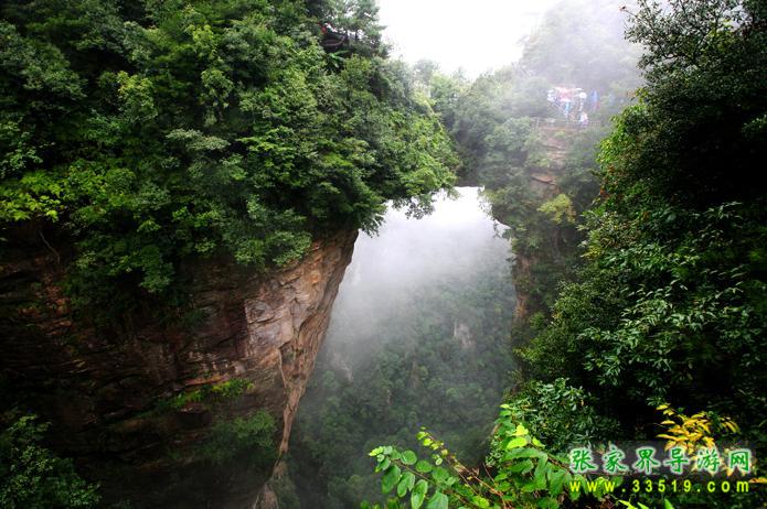醉月臺(tái)西去兩百余米,有一座50多米長(zhǎng),15米厚的條石搭在兩座山峰之間,其下嵌空350多米,這就是名聲赫赫的天下第一橋。橋約20米長(zhǎng),最薄處約4米厚,最窄處只有2米多寬。與兩邊橋墩合為一體,天衣無(wú)縫。橋面兩側(cè)、橋頭兩壁上端均有綠樹簇?fù)?,郁郁蔥蔥,而橋下洞壁宛若刀削,草木不生。望橋臺(tái)有三處,其一在橋邊20米處,俯視橋面,但見兩側(cè)綠叢中間,一段平路通向彼峰,橋洞依稀,下端被密林遮住,往來(lái)其間,無(wú)甚驚險(xiǎn)。其二在橋左側(cè)30多米處的石壁上,透過樹枝向右下俯視,可見橋洞側(cè)面一部分,不知其下幽深幾許,若逢雨后初晴,有云霧在眼前突涌,亦不明其由來(lái)。最扣人心弦的是繞過右邊長(zhǎng)達(dá)1200多米的“U”形深谷,隔200余米的澗谷向東觀賞,橋面橋洞,橋壁橋底,一覽無(wú)余。它造型巍峨,偉岸雄奇,高峻深險(xiǎn),形神逼真,確屬大自然神工鬼斧之杰作。