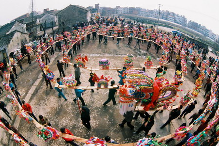龍舞是中國(guó)民間體育藝術(shù)。大庸境內(nèi)的板凳龍是 別具一格的龍舞形式。尤其桑植縣白族人民,對(duì)舞板 凳龍有著特殊偏愛。 白族同胞耍板凳龍,相傳起于漢代,由白族先民 “舞龍求雨”的宗教活動(dòng)演變而來(lái)。 板凳龍有兩種樣式。一種是簡(jiǎn)式板凳龍,由二個(gè) 舉長(zhǎng)凳為頭,一人在后選適當(dāng)“舞臺(tái)”表演;另一種 是“篾扎板凳龍”,即用竹篾扎成龍形置于板凳之上 ,以木腳示龍爪,造型美觀,逼真。耍板凳龍又分兩 種舞式,一為獨(dú)凳龍,一為九節(jié)龍(九張板凳相接)。 舞板凳龍動(dòng)作有“二龍搶珠”、“黃龍穿花”、“二 龍戲水”、“金蟬脫殼”、“黃龍盤身”等。永順、 慈利還流行草把龍,其龍耳稻草扎成。龍舞還有“干 龍”、“濕龍”之分,“干龍”多為娛樂,“濕龍” 則為求雨。“龍”到之處,百姓必潑水助威,舞者一 身透濕,盛為熱烈歡快。