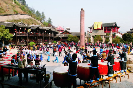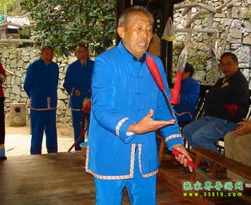 三棒鼓,唐代稱三仗鼓,明沈行符《顧曲雜言》 曰:“吳下何來(lái)有打三棒鼓乞錢者,余幼時(shí)有見之也, 起于唐咸通中(公元865年)”約于明代傳入本境, 并逐漸成為群眾增聞樂見的民間藝術(shù)形式。每年春節(jié) ,藝人們結(jié)伴走村竄寨拜年,表演對(duì)象不分貧富,戶 戶必到。如遇貧寒之家,表演者將別家贈(zèng)送禮品相送 ,意在人人過節(jié)歡喜。充分體現(xiàn)出土家族人熱情好客 ,心地善良的民族性格,對(duì)加強(qiáng)民族團(tuán)結(jié)有一定作用 。 三棒鼓通常由三至五人組成,一人擊鼓唱詞,一 人鑼鈸配樂,一人?;ò??;ò羧?,長(zhǎng)一尺,舞者 左右手各持一根,將另一根拋在空中,左右開弓,擊 打空中花棒使之不落地。也有以刀代棒,以五刀代三 棒的技藝。技藝高強(qiáng)者,突然把刀拋得極高,來(lái)一個(gè) 眼花繚亂,不禁稱絕。打三棒鼓,通常有“鬧春耕” 、“收割打場(chǎng)”、“慶豐收”、“拜年節(jié)”四套,分 “鯉魚跳龍門”、“玉女穿梭”、“板巖漂灘”等項(xiàng) 目。打三棒鼓技巧性強(qiáng),表演時(shí)需高度集中,用力適 當(dāng),貫通一氣,并與演唱者默默配合。