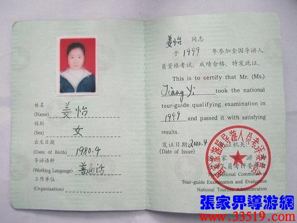 | 姜怡,女,導(dǎo)游員資格證書編號:Hun990125。 大專學(xué)歷,自99年9月森林保護(hù)節(jié)前開始從事導(dǎo)游工作,同年十二月參加全國導(dǎo)游員資格考試,并以優(yōu)異成績?nèi)〉谩皣鴮?dǎo)證”,現(xiàn)為張家界華天國旅旅行社的專職導(dǎo)游員。整個帶團(tuán)期間,無論團(tuán)隊(duì)或散客,未出現(xiàn)一次旅游事故或游客投訴事件,普遍反映帶團(tuán)效果好。 | 導(dǎo)游自述