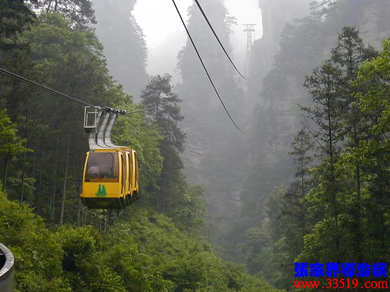 (索道站)現(xiàn)在,我們就要乘索道下山了。黃石寨(黃獅寨)索道是1995年5月至1997年9月臺(tái)灣證吉興業(yè)有限公司與張家界公園管理處合資興建的我市第一條觀光索道。索道線路水平距863,高差431米,運(yùn)行速度每秒8米,單向小時(shí)運(yùn)量948人,設(shè)備全部從法國(guó)波馬公司引進(jìn),總投資4000多萬人民幣。黃石寨(黃獅寨)索道的建成,為公園開辟了一條空中游覽線,填補(bǔ)了張家界無觀光索道的空白。古詩(shī)說:會(huì)當(dāng)凌絕頂,一覽眾山小。乘索道觀張家界公園,別是一番感受。