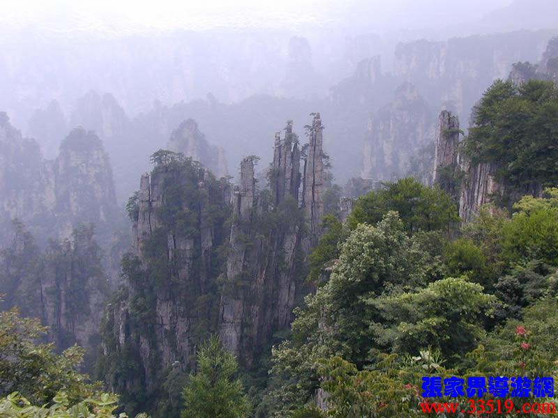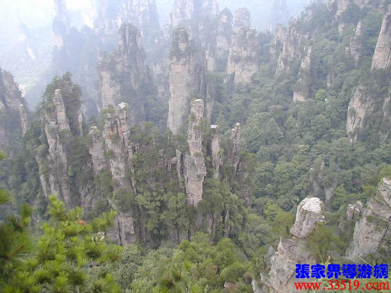 (大觀臺(tái))這就是大觀臺(tái)。極目遠(yuǎn)眺,千百座奇峰盡收眼底。一位詩(shī)人說(shuō),武陵源的砂巖峰林是一步一觀景,千步千造型,一山有四季,十步不同天。專家測(cè)算出武陵源石峰有3103座。一如一位高超的雕塑大師,模擬宇宙萬(wàn)物,無(wú)不形狀逼真,維妙維肖,栩栩如生,呼之欲動(dòng)。有的如海螺出水,有的如金龜銜日,有的如蓮花盛開,有的如天橋橫空,有的如長(zhǎng)槍刺天,有的如寶塔聳立,有的如老人采藥,有的如玉女梳妝,有的如將軍出征,有的如戰(zhàn)馬長(zhǎng)嘯,有的如情人幽會(huì),有的如夫妻相擁,有的如仙女散花,有的如村姑守望有的孤峰獨(dú)秀,有的直插云霄,有的婷婷玉立,有的威武勇猛,有的小巧玲瓏,有的大氣磅礴。進(jìn)入武陵源,但見一片峰的森林,峰的世界,峰的海洋。挺拔、奇秀、集中、原始、粗獷、古野。這就是武陵源。一位藝術(shù)大師說(shuō):武陵源的山峰,改寫了山的概念。大攝影家陳勃說(shuō):“三山五岳堪比美,華夏風(fēng)光每一流。”王繼杰先生說(shuō):“武陵源上三日游,勝讀千篇李杜詩(shī)。”許世杰先生說(shuō):“秀幽險(xiǎn)峻稱奇絕,五岳黃山拜下風(fēng)。”李成瑞先生為此大抱不平:“神州勝景誰(shuí)為最?須請(qǐng)霞公重評(píng)勘。”可惜徐霞客無(wú)緣到大觀臺(tái)來(lái),也不可能為武陵源作甚評(píng)價(jià)了。
