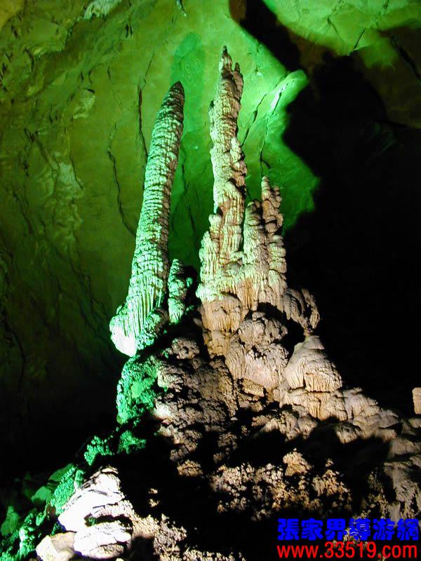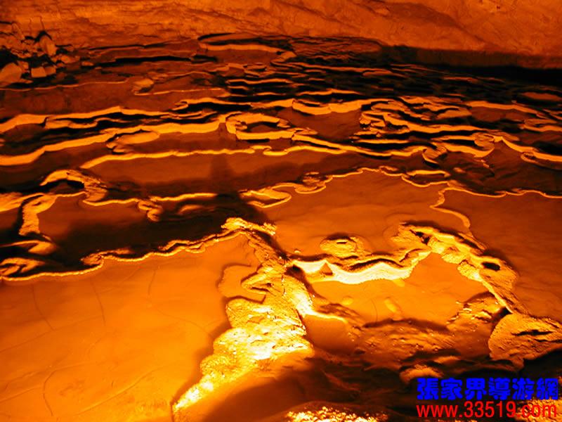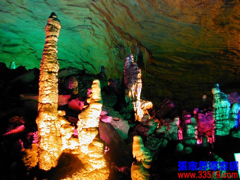 (龍宮)龍宮是黃龍洞十三個大廳中最大的一個,也是景色最美的景點之一,底面積15000平方米,平均高40米,兩千余根石筍拔地而起,千姿百態(tài),異彩紛呈,或如飛禽走獸,或如宮廷珍藏,有的像巍巍雪松,有的像火箭升空。龍宮后園有金銀兩座花池,清水常溢,花簇盛開。宮頂鐘乳柳垂簾掛,四周壁畫栩栩如生。溶解著各色各樣的礦物質(zhì)的水,從巖層中滲透出來,滴落下來。礦物質(zhì)在洞頂凝固結晶成倒懸鐘乳石,從鐘乳石滴落的水又把礦物質(zhì)澆疊、堆壘在洞底,而長成節(jié)節(jié)向上的石筍。大家看看這龍宮的造型,領略這磅礴的氣勢。洞內(nèi)最大石筍,高12米、直徑10米的漢白玉天然石椅“龍王寶座”居高臨下,眾多石柱石筍似人似物,維妙維肖,圍著寶座朝拜山呼,幾十座珊瑚亭亭玉立,儼然一支龐大的“宮廷樂隊”。湖南著名教授羊春秋先生作《寄生草》詞對此進行描繪:“百態(tài)千姿模樣,三宮六院門巷。龍王開宴設瓊漿,猴王偷果鬧天堂,君王納寵擁羅帳。搬演了人間爭攘,匯集了天下奇觀。”