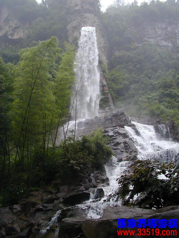(聽瀑樓)朋友們,寶峰湖游結束了,大家一路辛苦了?,F(xiàn)在,我提議到“聽瀑樓”歇歇腳,洗洗汗,聽聽音樂,養(yǎng)好精神再趕路。你們看這民族式建筑,背依砂巖石峰,面朝寶峰飛瀑,登斯樓也,品土家之香茶,聽瀑布之濤聲,此情此景,怎不令人感嘆人與自然傾心交談的空靈境界?
