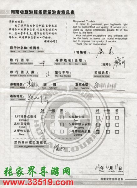 2009年10月9日深圳李先生一行2人質(zhì)量接待反饋單: