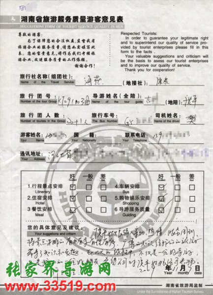 2009年11月3日河北田先生一行20人旅游接待質(zhì)量反饋單: