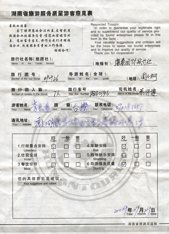 9月26日臺灣李先生一行7人接待質量反饋單: