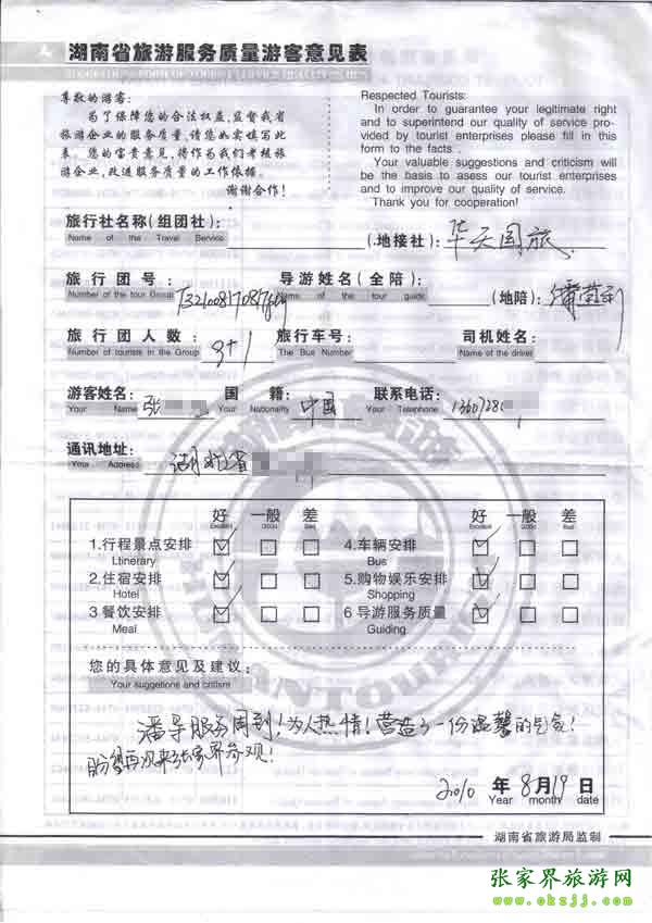 2010年8月19日湖北張先生一行九位旅游點評:導游服務周到熱情,盼下次再來張家界