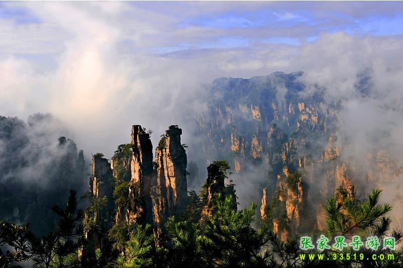 天子山因明初土家族領(lǐng)袖農(nóng)民起義領(lǐng)袖向大坤自號“向王天子”而得名。天子山東臨索溪峪,南接張家界,北依桑植縣,是武陵源區(qū)四大風(fēng)景之一。它位于“金三角”的最高處,海拔最高1262.5米(昆侖峰),最低534米(獅蘭峪)。景區(qū)總面積67平方公里,環(huán)山游覽線有45公里。
